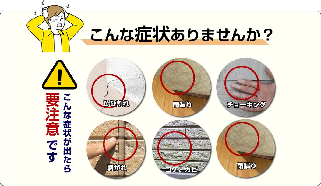 建物は、長年にわたる紫外線や雨風の影響を受け続けると劣化し、色褪せや雨漏り、ひび割れなどが起こりうるものです。